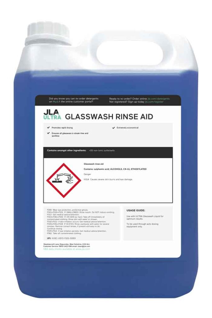 The JLA Ultra glasswash rinse aid has been specifically formulated to promote rapid drying times and eliminate streaks and spots on your finished glassware. It also discourages film build-up and improves head retention, lacing and gas breakout.